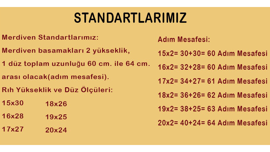 Merdiven basamakları 2 yükseklik, 1 düz toplam uzunluğu 60 cm. ile 64 cm. arası olmalıdır. Buna adım mesafesi denir.